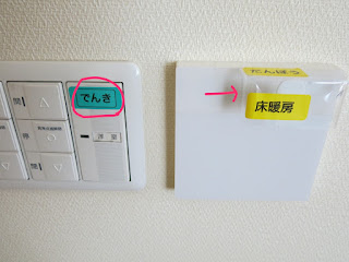 スイッチの押し間違えそうな所にはテプラで作ったテープを貼り、床暖房のスイッチはどうしても間違えて押してしまうので、何かの家電品が入っていたポリ製ケースでカバーをして簡単に押せない様にしました。